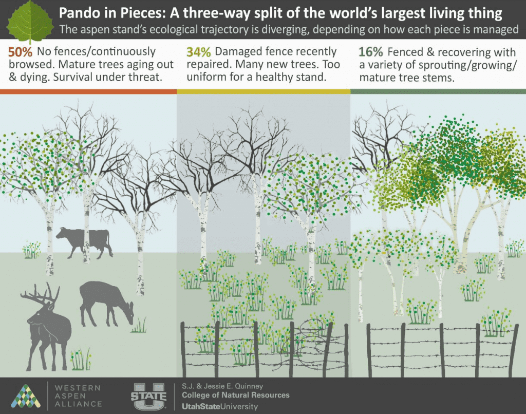 犹他州立大学的一位生态学家提出了一种暗淡的可能性,即世界上最大的生物之一——一群基因相同的树木,共享一个根系,历史上第一次分裂成多个不同的部分。