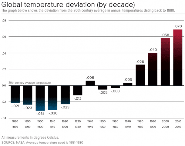 上面的视频是由NASA和美国国家海洋和大气管理局发布描述温度上升的发展随着时间的推移,最终在橙色和红色色调覆盖整个地球像我们到达最近的几十年。