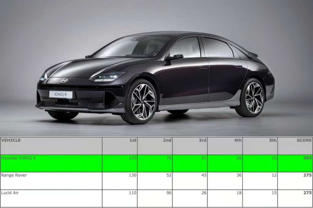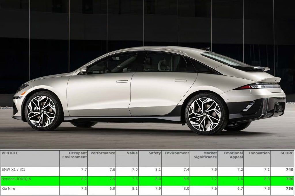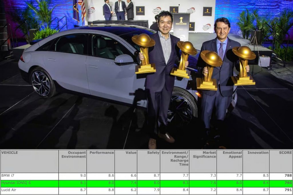 Ioniq 6,这是第二个模型从现代的专用电动子品牌,赢得了2023年世界汽车,2023年世界电动汽车,今年和2023年世界汽车设计奖项,模仿成功的第一个模型系列,Ioniq 5, 2022年赢得所有这些类别。