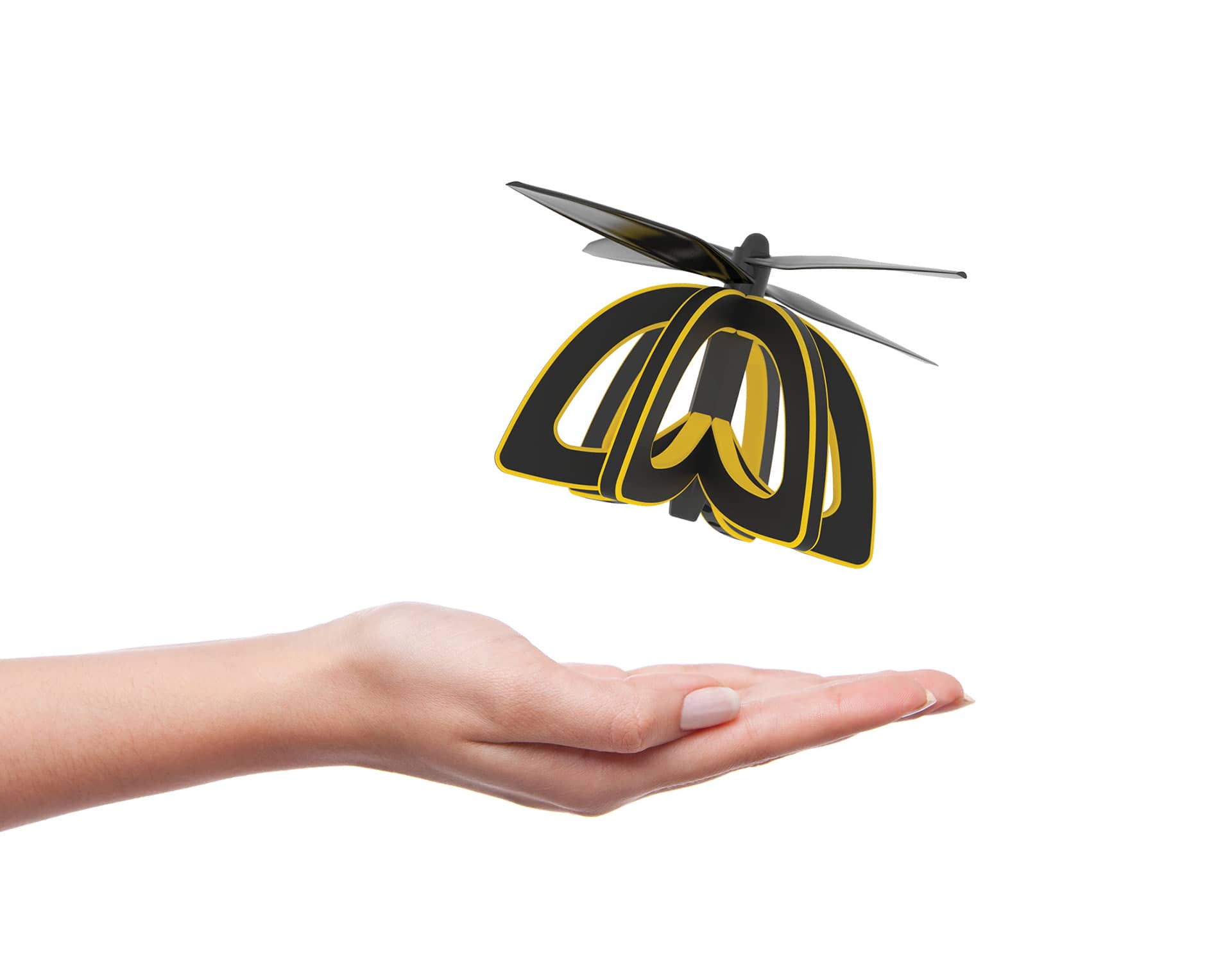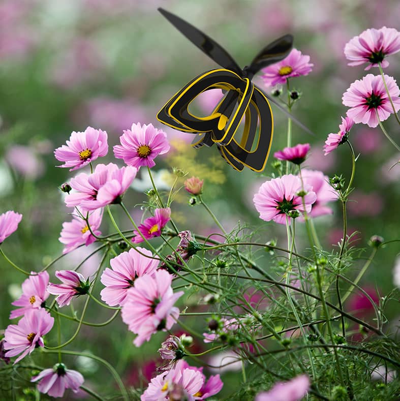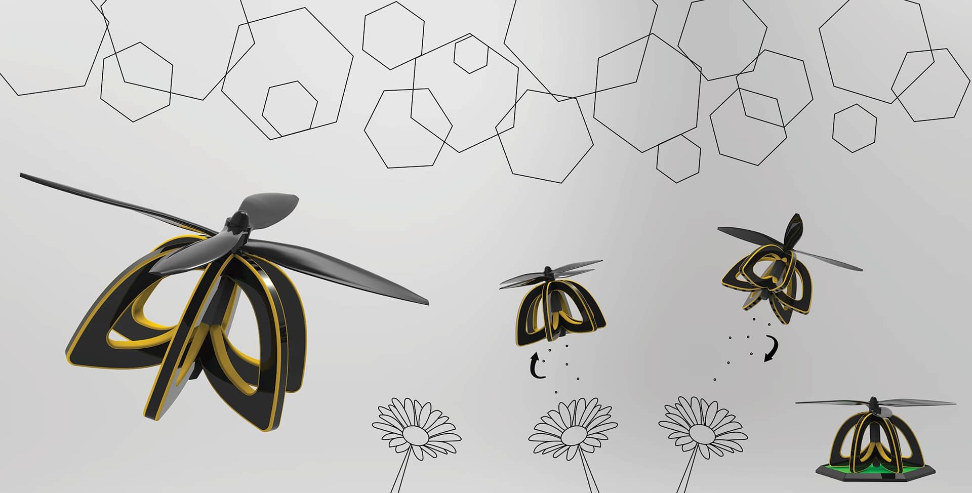无人机条纹黄色和黑色模仿蜜蜂的图像。在50种不同的设计变化后,创建了形状像花一样的最终原型。它是由塑料制成的,内部是泡沫。“计划蜜蜂”的当前版本是拳头的大小。