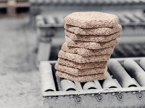 云杉已在该项目中使用,其纤维已与水泥结合在一起,以提出一种便宜的材料,并具有所需的热性能。水泥赋予水分抗性,强度和防火。制造过程也很容易。从原木上切开木片,并与水混合,最终将它们放入模具中,以便将其置于形状。对于这个特定的项目,形状是六角形。