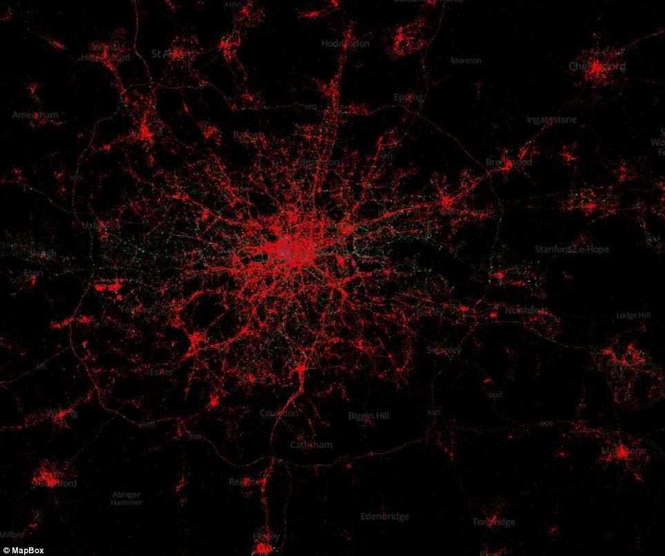 人们常说,一个人的手机不仅可以透露自己的收入,而且可以预测他所居住的城镇。一项研究生成的新地图表明,在世界上最大的城市中,苹果的iPhone所有者居住在富裕地区,而收入较低的地区的居民拥有Android手机。下面的地图显示,Apple产品所有者(以红色显示)居住在中央地区,而Android所有者(以绿色为例)更喜欢住在城市的郊区。