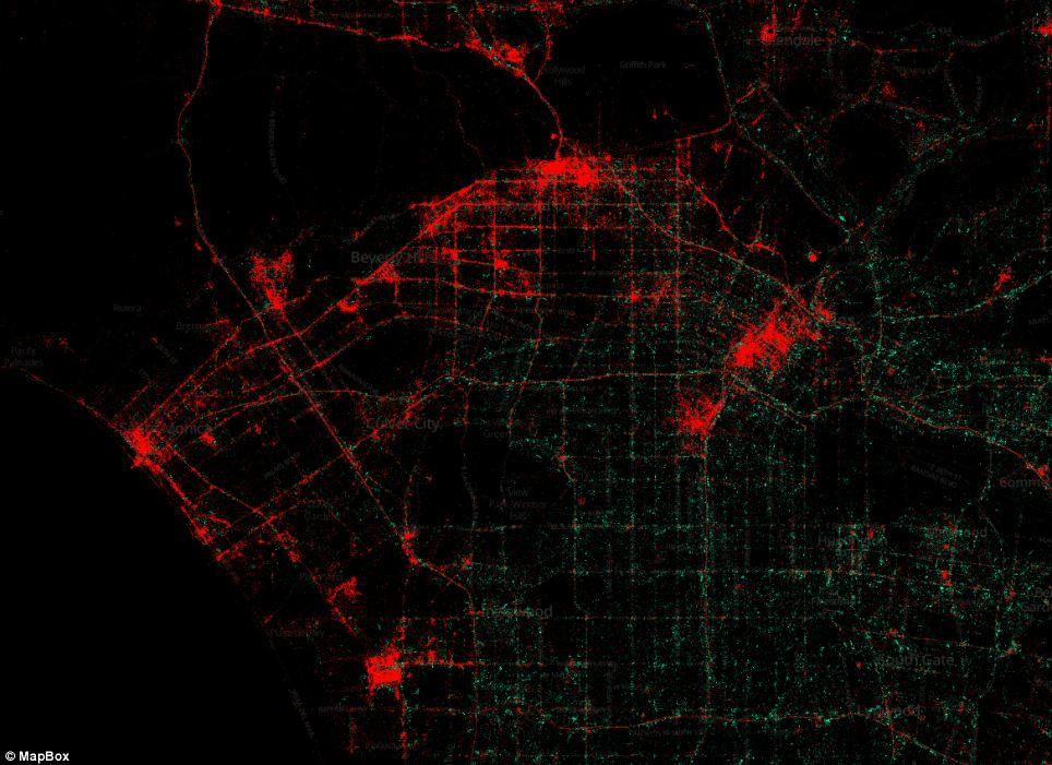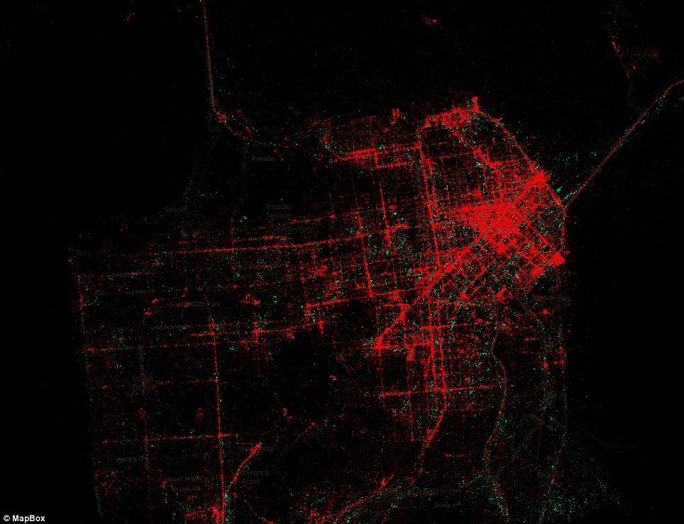 为每个手机提供了不同的颜色,可以独立更改。“每个城市的使用模式通常反映经济分层。例如,红色的iPhone主要在城市的富裕部分中,而绿色的Android手机在较贫穷的部分中的承保范围更高。”