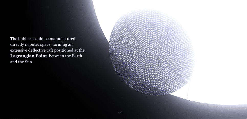 “地球工程可能是我们最后也是唯一的选择。然而,大多数地球工程方案都是针对地球的,这对我们的生活生态系统构成了巨大的风险,”一个致力于解决方案的网页上写道。“如果我们能在太阳辐射到达地球之前偏转1.8%的太阳辐射,我们就能完全扭转今天的全球变暖。”