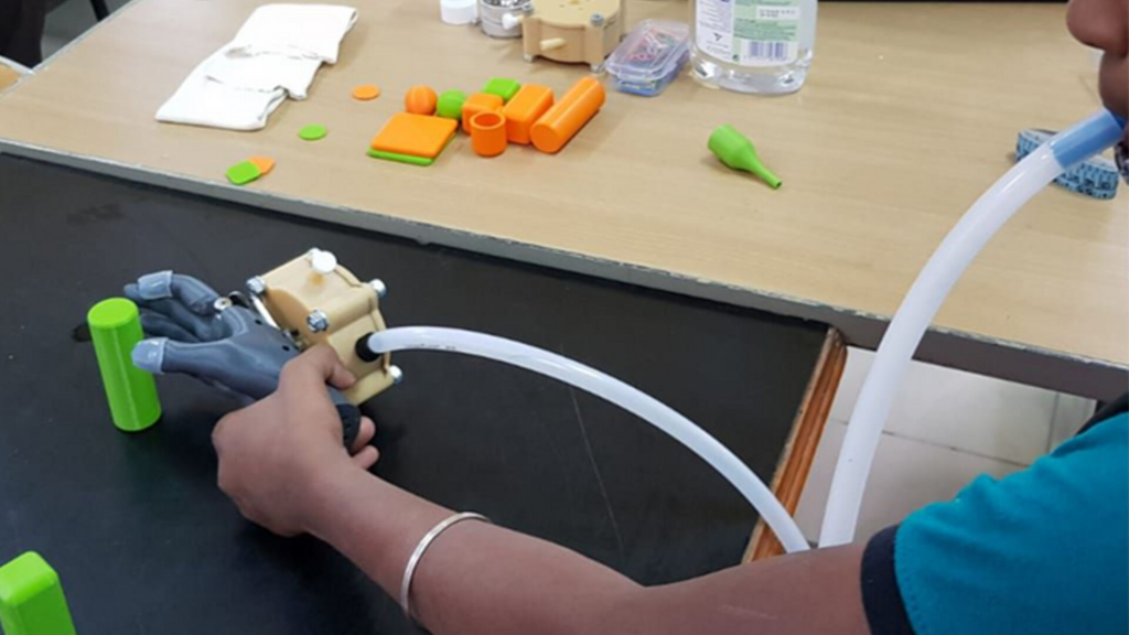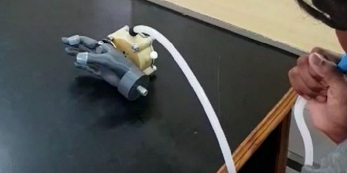 用户操作一个专门设计的小型特斯拉涡轮机这通过管理呼吸来控制假肢的运动。幼儿可以为设备提供适当量的空气,并且设备的齿轮调节抓地力运动的速度。
