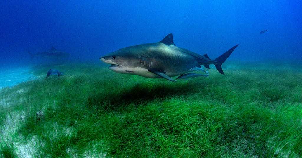 为了测量巴哈马群岛海草草地的范围,研究人员在虎鲨的背鳍上安装了摄像机和跟踪器,以便获得数小时的海底镜头。