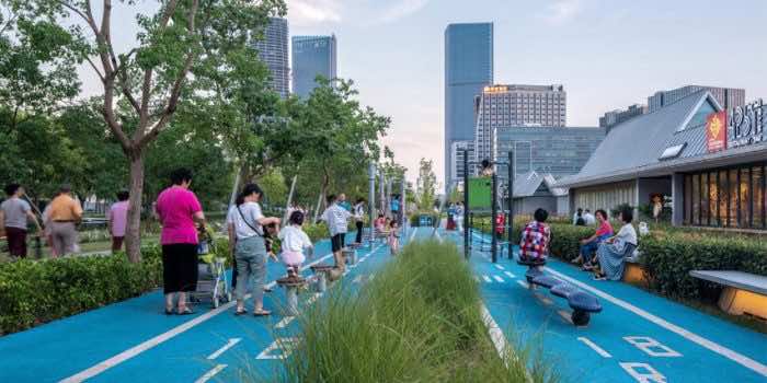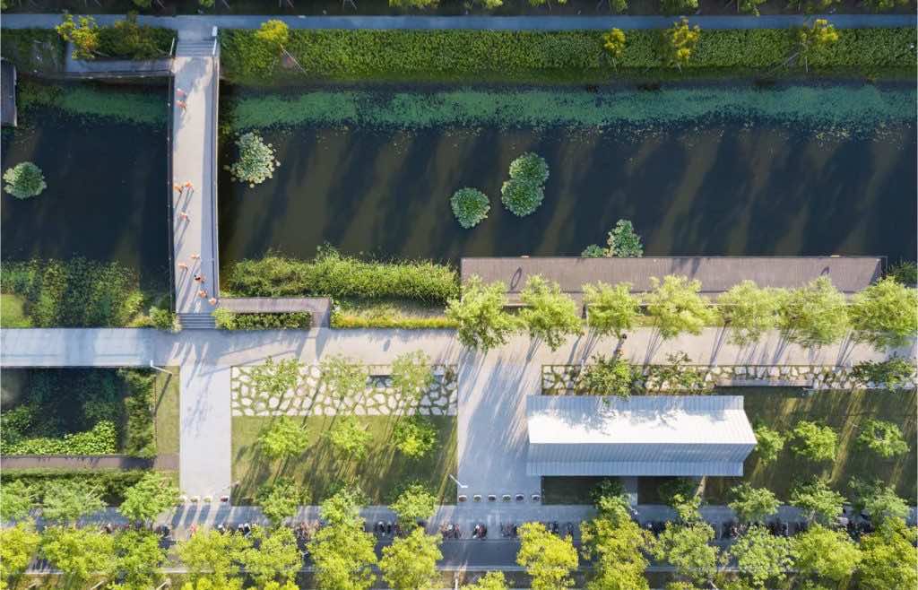 雨水聚集在公园,周边道路和过滤后的水体。项目被授予中国绿色建筑奖,因为使用环保材料,暗示可持续实践,比如LED照明和可持续的竹子。
