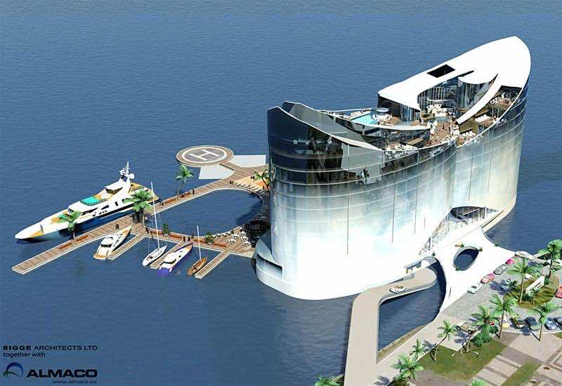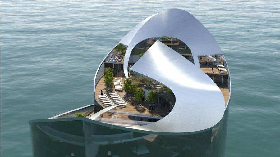 Gam Group的发言人说;‘This is a true five star hotel on water with all the same amenities as in a typical five star hotel – restaurants, conference centre, shopping centre, spa, night club, speciality restaurants, bars, major rooftop pool area, hotel rooms, suites and a parking garage.’ According to Almaco, the tenants of this hotel will have ‘the additional experience of floating on water and all around access to exceptional views.’ It further says; ‘A floating hotel is a viable option for areas where land is scarce, fully developed or challenging to develop.’
