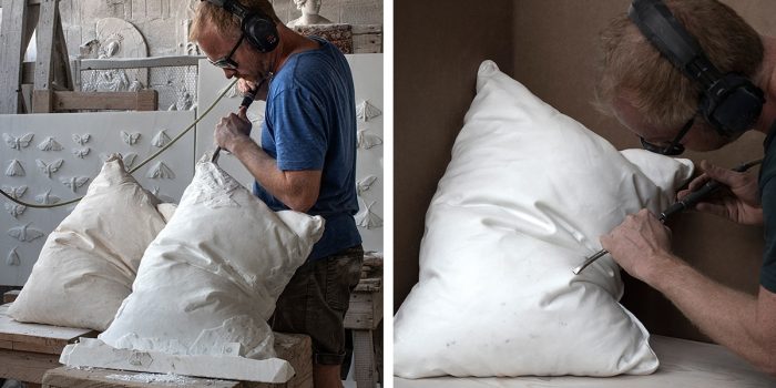 不仅是主要成分,而且整个食谱还利用气动锤和凿子来在正确的位置带来正确的折痕。惊人的设计超出了普通人的想法,绝对使它看起来像是一个普通的羽毛填充枕头。皱纹和折叠的能力,使我们重新考虑大理石的功能。