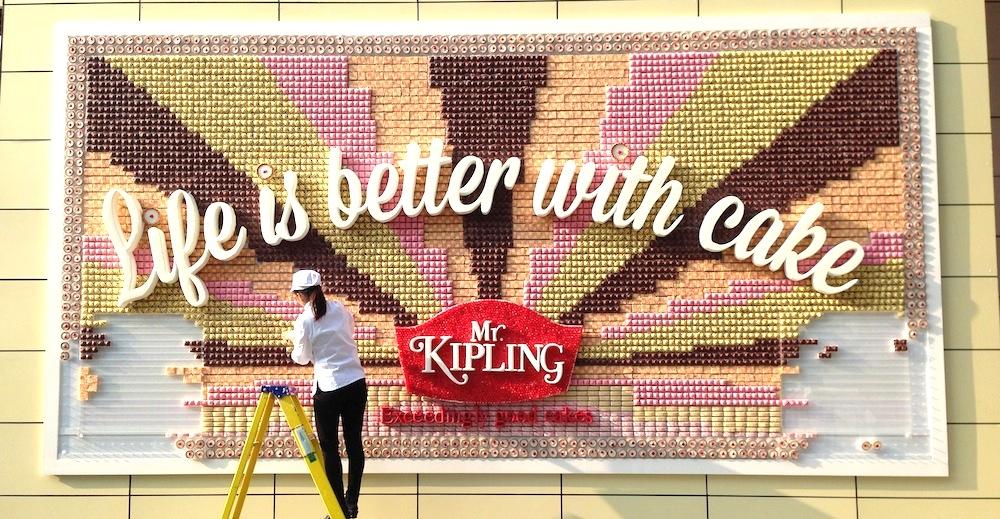 该广告牌位于Shepherd's Bush的Westfield London,并用Kipling先生的13,360蛋糕建造。由于将蛋糕交给经过的乘客,广告牌仍在展出约8个小时。这是营销和散布一些好蛋糕的独特方式,您不认为吗?