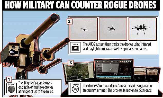 据国防部消息人士称,英国设计的这套系统被称为AUDS——反无人机防御系统——今年早些时候在苏格兰进行了测试,并已被证明对遥控无人机和遵循预先设定的飞行路线的无人机有效。据AUDS的制造商称,该系统需要大约10-15秒的时间来锁定和干扰处于“蜂群攻击”编队中的多架无人机。然而,这项技术被设计成不会影响任何使用加密通信的商用或军用飞机。