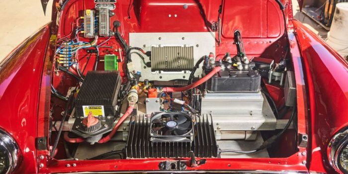 他把电池管理系统、马达控制器和dc - dc转换器安装在汽车前部的发动机舱里。刹车一直保持原样。