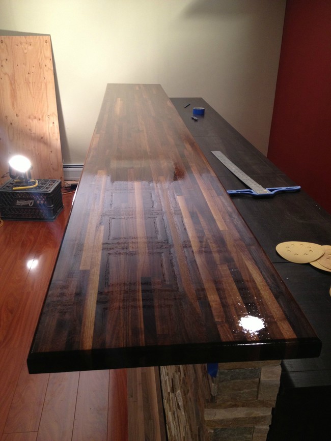 从屠夫块中创建了条形表面,并结合了水密封剂和光泽树脂,使其最终触摸。