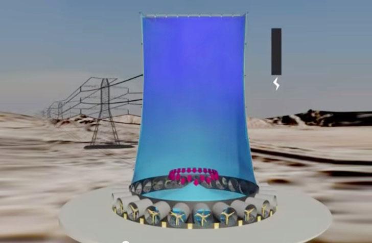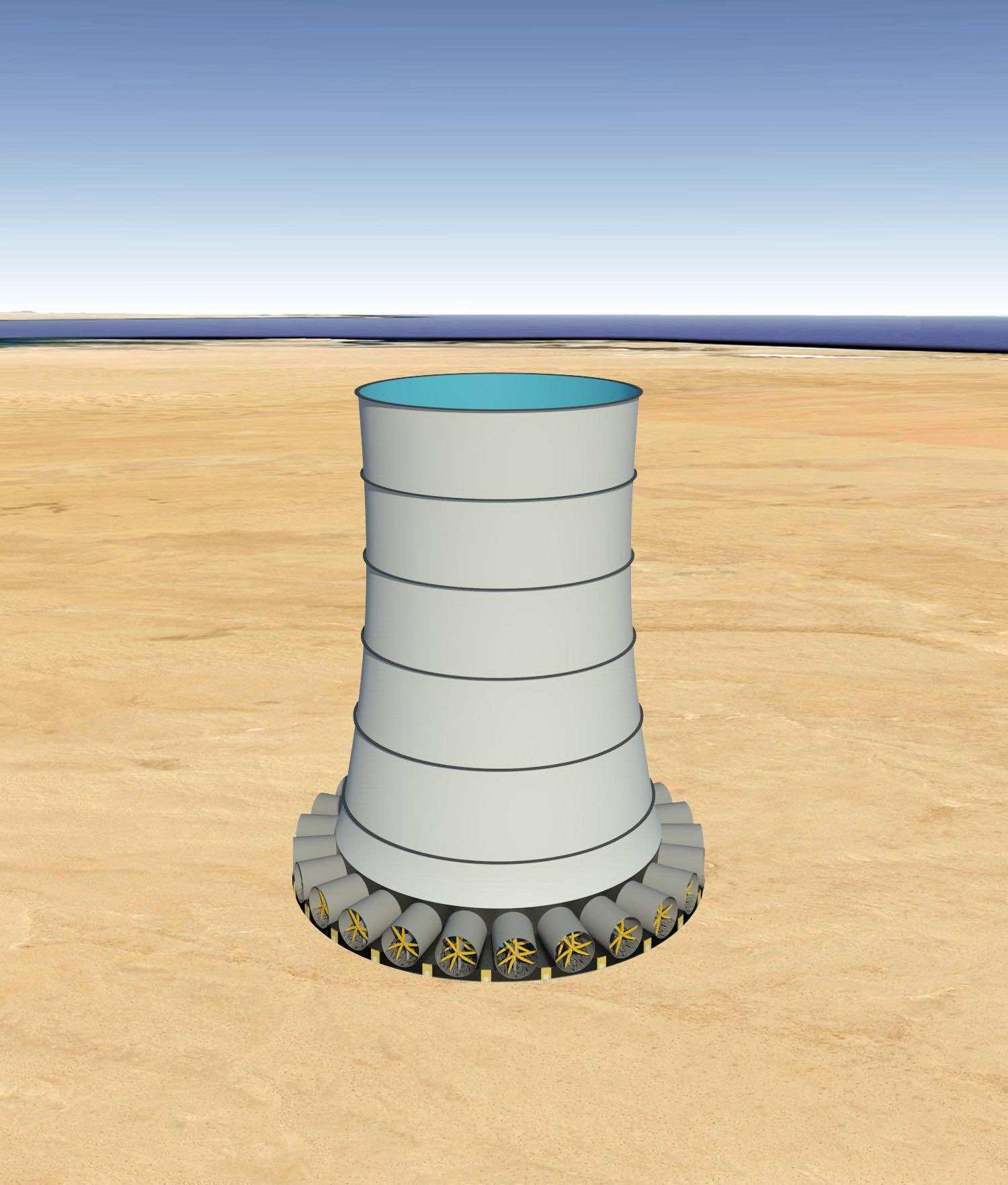 该塔被称为太阳能塔,将其高度为0.8公里,根据索赔,应像胡佛大坝一样发挥作用。该塔是通过从顶部喷到水中的水来工作的,这使空气沉重并使其向下掉落。这导致120个涡轮机在底部旋转并产生能量。根据公司的索赔,在晴天的最大运营时,该塔可以产生约1,250兆瓦时。这个数量等同于风力涡轮机将获得的能量,该能量分布在约100,000英亩的土地上。