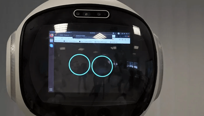 GARMI安装在一个轮式平台上,白色的身体和一个黑色的屏幕,显示两个蓝色的圆圈作为眼睛。
