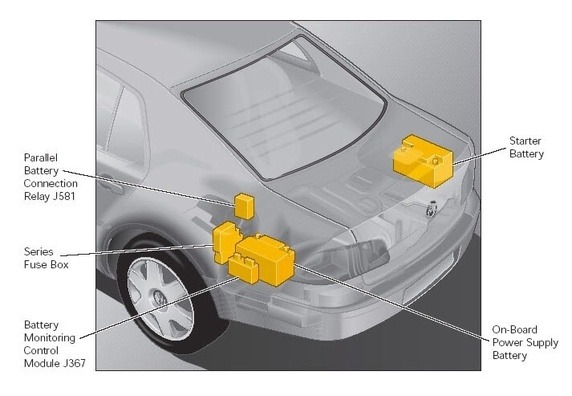 Phaeton有两个汽车电池。一个启动器电池和另一个用于配件的电池。如果起动器电池故障,则配件电池必须接管。