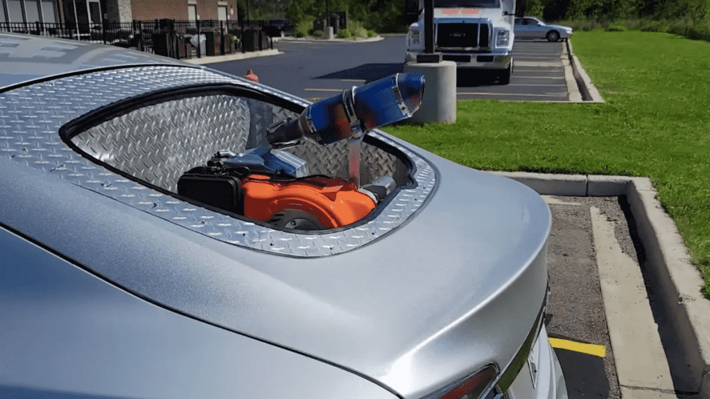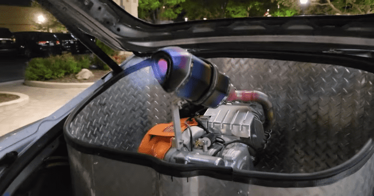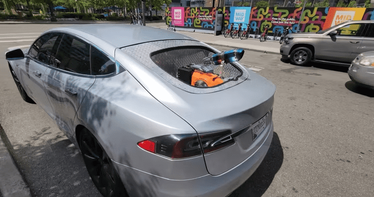 所以他想出了一个非常独特的方法。他改装了特斯拉Model S,成为有史以来第一辆无绳特斯拉。此外,他还成功地让这辆车在不充电的情况下行驶了1600英里以上。此外,他使用汽油而不是插入式充电器为汽车充电。