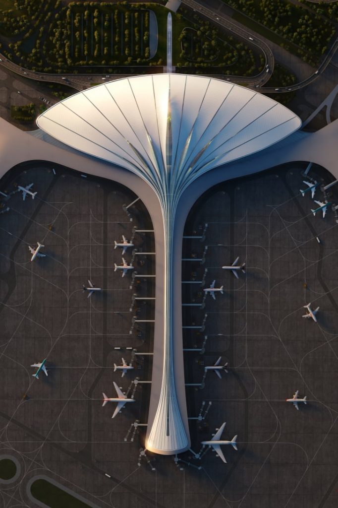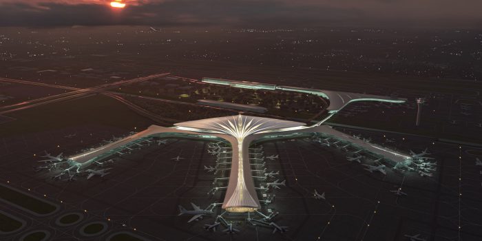 该方案是与中国机场规划设计院和北京建筑设计研究院合作设计的,是中国各地众多引人注目的新建或扩建机场之一。在全球和国内建筑师的监督下,不久前完成的项目包括由著名的扎哈·哈迪德建筑事务所领导的北京海星式的大兴国际机场,以及成都新天府国际机场,其形式向传奇的太阳鸟致敬。