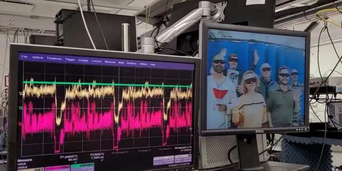 就无线电接收机而言,输入信号通过稳定的载波信号进行调制,然后通过喇叭天线传输。由于这种传输,团队检测到原子的能量转移,然后将其视为输出信号,并以VGA格式获得。然后把它塞进电视机里,最终播放了一段视频。但是要从这个信号中获得实时视频,输入信号是通过摄像机传输的。同时考虑初始输入信号,对两个信号进行观察,生成视频直播。观看下面的视频,深入了解这个过程: