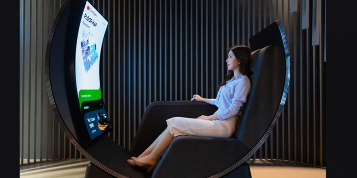 LG的媒体椅子概念具有大型的半圆形座椅系统。内部是一个躺着的椅子,弯曲的55英寸LG OLED和内置的Cinematic Sound Oled(CSO)。躺椅和屏幕都在圆圈内旋转。这使屏幕与观看器完美对齐。屏幕也可以旋转90度。
