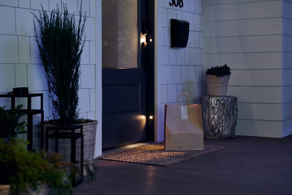 戒指视频门铃,耶鲁大学确保带有Wi-Fi和蓝牙的智能锁,Wi-Fi和蓝牙驱动的PIR运动传感器,一个使用门铃的传感器阵列来确定门是打开还是关闭的门状态传感器and motion-activated LED lighting embedded in the door’s threshold are all included in this wooden frame’s technology.