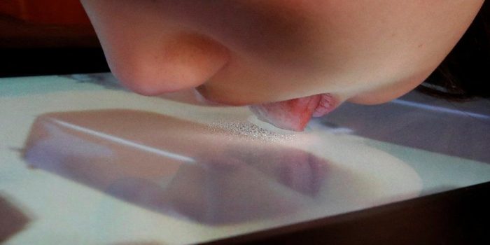 一个明治学生证明TTTV,声称她想品尝甜巧克力显示在屏幕上。尝试几次后,自动语音重复命令和风味飞机喷洒样本到塑料薄膜。