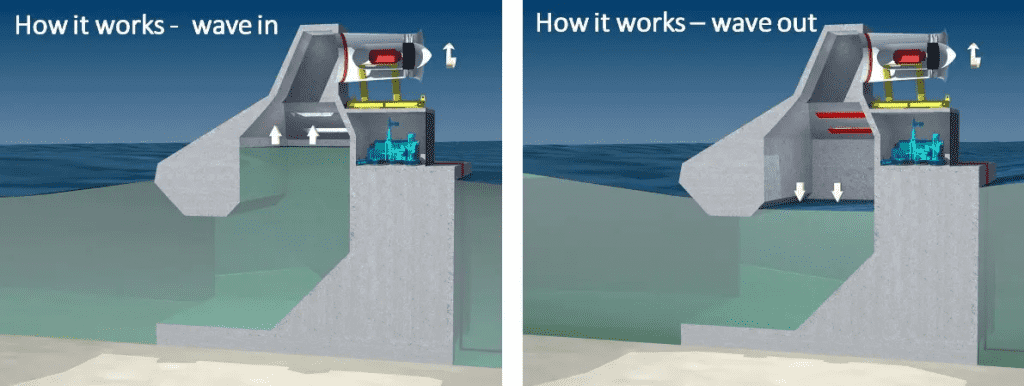 这个能源系统的灵感来自振荡水柱的概念,波浪冲进一个房间,置换空气,使涡轮机旋转来发电。