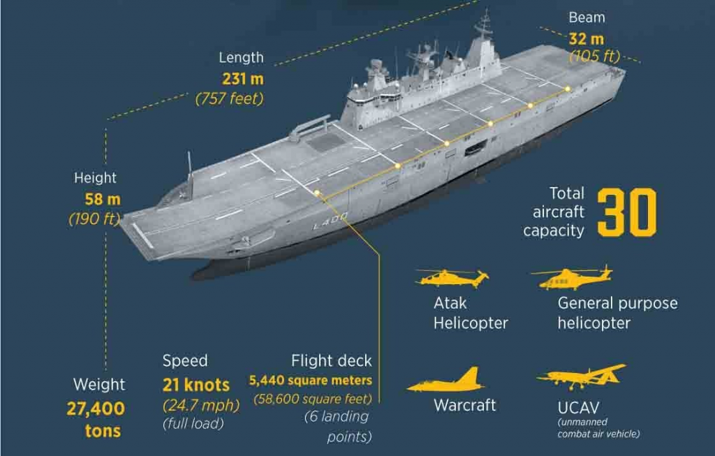 这艘船是一种多功能直升机着陆码头(方面)两栖攻击舰设计无人机(uav),无人作战飞行器(无人机),和“战斗机,除了直升机。