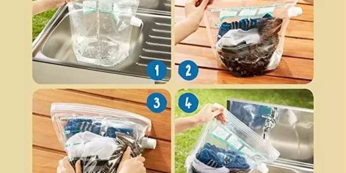 释放出这种脏水后,再次向袋子中加入一些淡水,然后开始重复此过程,直到您需要的次数多次。当您满意衣服被清洁时,请打开拉链并在取水后将衣服取回。但是,如果您没有足够的资源来洗衣服,则塑料袋也可能非常有用。根据使用此袋子的人所共有的意见,“该设备最多可用于10轮洗衣店”。根据袋子的大小,这绝对还不错。
