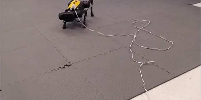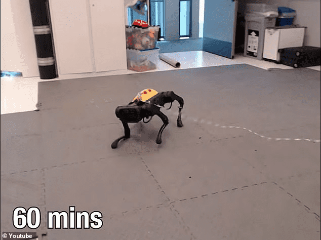 研究人员发布了一段视频,在视频中,一开始可以看到这个四条腿的机器人在空中挥舞着双腿,挣扎着,10分钟后,它就能迈步了。它从背上滚下来,甚至被一名研究人员用棍子打翻。