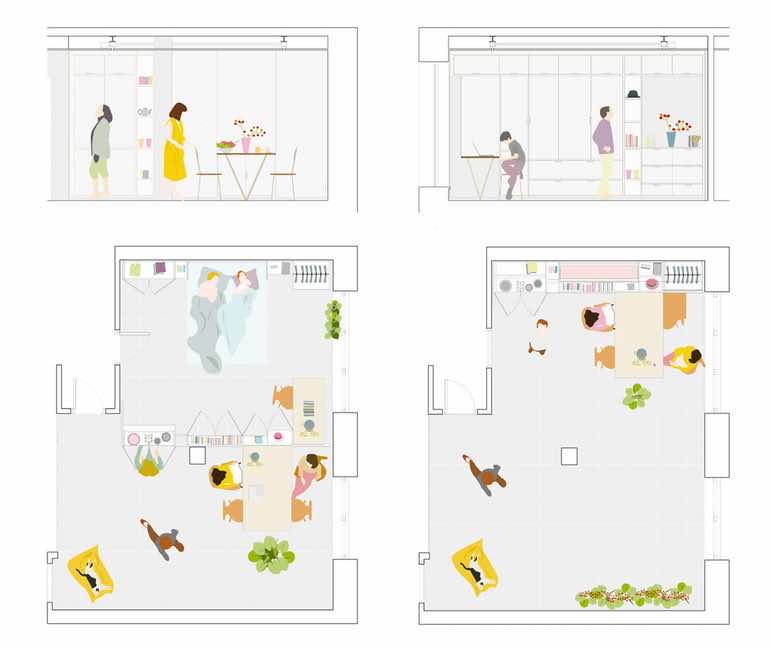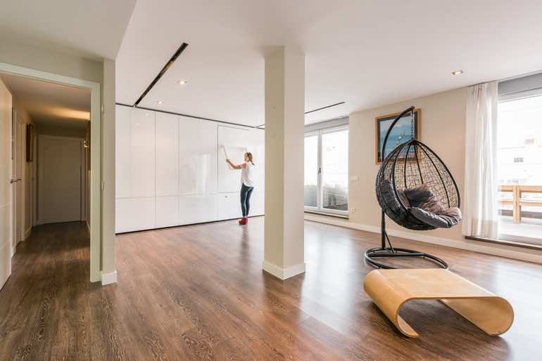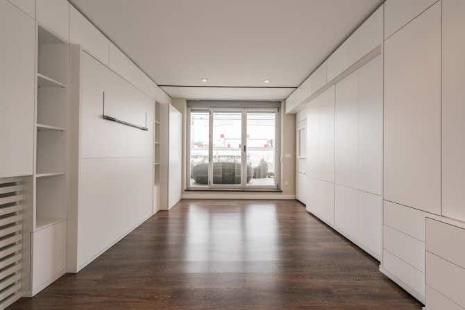 该系统是基于一个工业单元,运动墙从轨道上垂下来,这些轨道被建成一个假天花板。一旦激活,这个过程大约需要30秒完成,并转换400平方米。英尺的生活空间变成160平方英尺。一英尺的客房和一个减少但可行的240平方。英尺生活空间。通过公寓的露台进入客房。