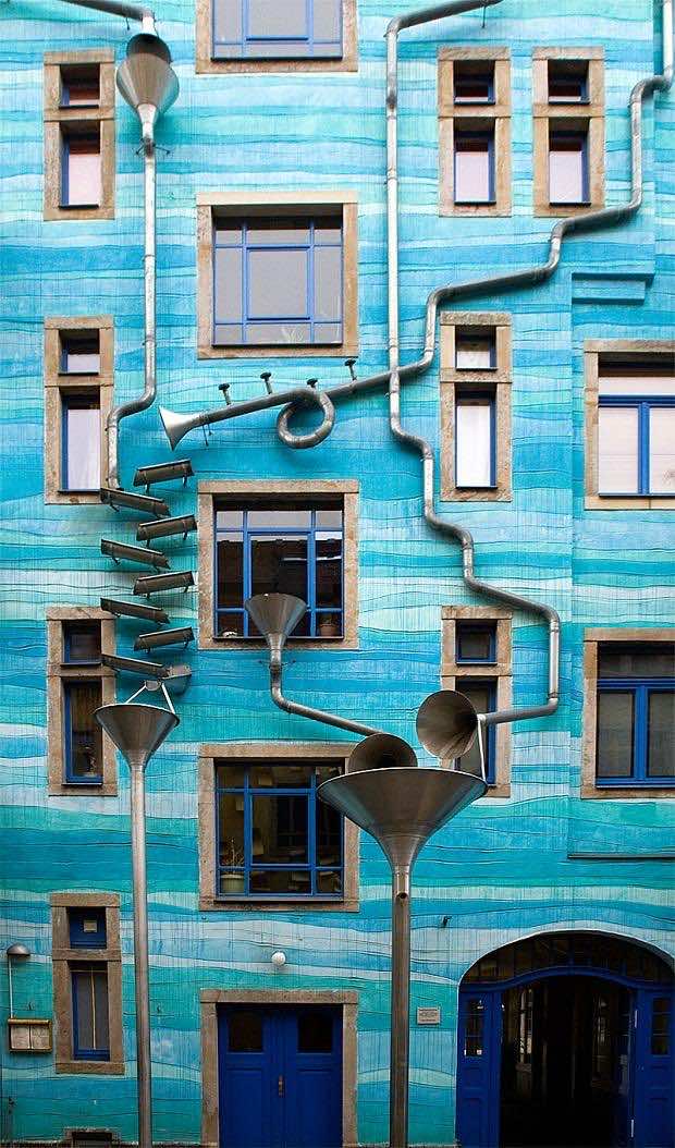 该建筑被称为“元素庭院”,是Kunsthofpassage系列庭院的一部分,Kunsthofpassage是公寓大楼租户的脑力产物,这些艺术品被安装在公寓大楼上。这件特别的艺术品来自雕塑家Annette Paul和设计师Christoph Rossner和Andre Tempel。这个想法的灵感来自鲁布·戈德堡机器,它可以将普通的雨声转换成交响乐,直接来自管弦乐队。