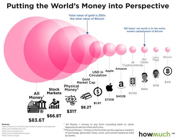 比特币在2009年1月启动的愿景颠覆全球货币体系。已经有近十年的释放,和网络货币及其可信度仍然是一个争论的话题。为了帮助理解比特币的价值,HowMuch.net放在一起一个图表展示比特币在世界经济的重要性。
