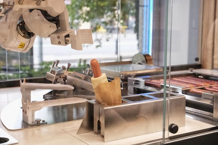 一种最近流行的新方法tiktok是一个机器人,旨在为付费客户组装热狗,即使在没有员工的情况下,餐厅连锁店也可以继续销售物品。