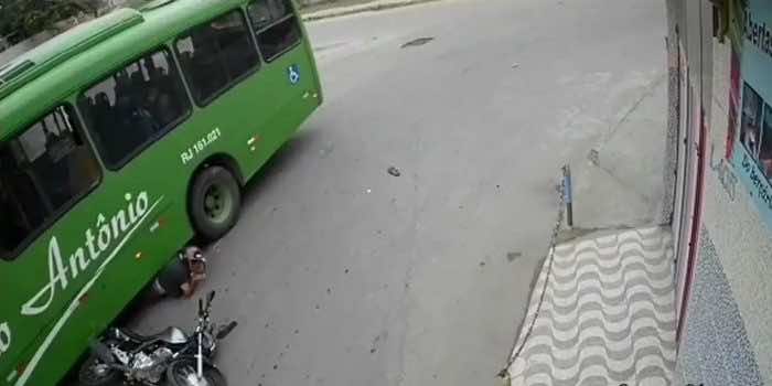 当地新闻媒体Penha news RJ 2.0捕捉到了这一事件的监控录像。视频显示,一辆绿色巴士正在左转,一名男子从摩托车上摔了下来,距离行驶的巴士只有几英尺远。当巴士司机猛踩刹车时,他的头几乎直接落在了后轮前面。他的头盔被夹在车轮下面,但没有坏,救了他一命。公共汽车司机的快速反应也应该受到赞扬。