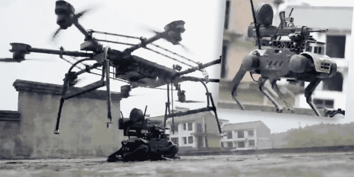 视频开头的画面是,无人机正在靠近建筑物的屋顶,将武装机器狗放在无人机的身下。然后,无人机降落在屋顶上,释放机器狗,然后逃跑,就像一种机器空投船。不久之后,机器狗从折叠的位置展开,开始在新的环境中导航,装备着一挺似乎是中国QBB-97轻机枪的武器。