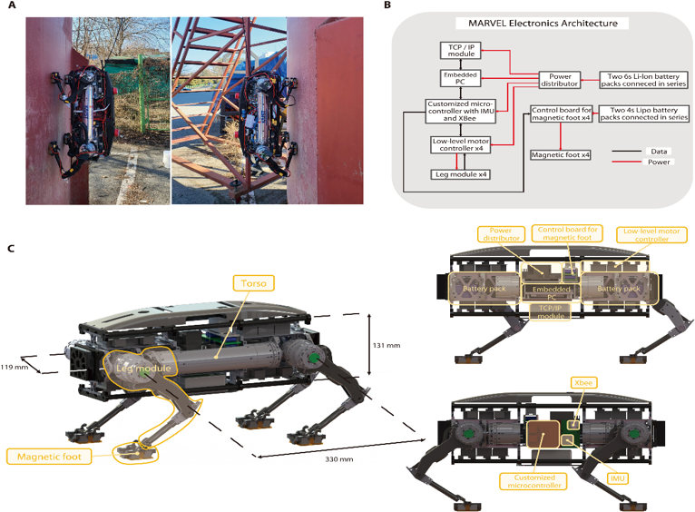 韩国科学技术研究院(KAIST)的研究人员和伊利诺伊大学的一位同事发明了一种四足机器人,它具有磁性足,能够攀爬和穿越金属墙壁和天花板。