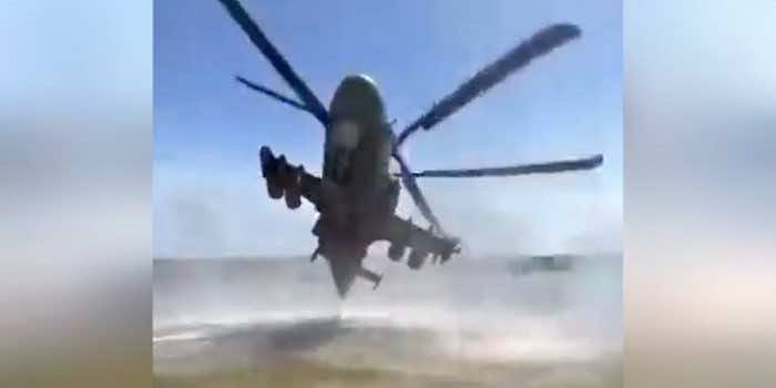 俄罗斯Kamov Ka-52“鳄鱼”攻击直升机在上方的新视频进行一个非常危险的特技乌克兰水。对每个人来说,这起事件是有风险的,包括飞行员。