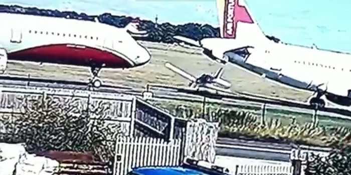 在视频中,喷气机在两架停放的飞机之间超速行驶之前,遇到了艰难的降落,几乎两者都缺少。在与红翼空中客车的前轮相撞之前,可以看到它的机翼尖端在穿过机场围栏之前撞击。