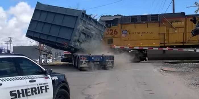 互联网上出现了一段新的视频,视频显示一辆满载的卡车在德克萨斯州法本斯的铁轨上被撞。这段视频记录了一起事故,一辆拉着一辆Lowboy拖车的卡车被卡在铁轨上,在那里停留了10分钟。所有人都预料到情况会更糟,但没人能及时做出反应,最终一辆火车以每小时约50英里的速度撞上了拖车。