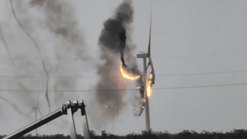 你可以在下面的视频中看到,即使在被闪电点燃后,风车仍然在旋转,但这一次,叶片是燃烧的,从而导致了烟雾圈的形成。然而,几秒钟过去了,大火变得更加猛烈,从而导致风车的整个结构解体。然而,制作视频的人说:“这太疯狂了!”