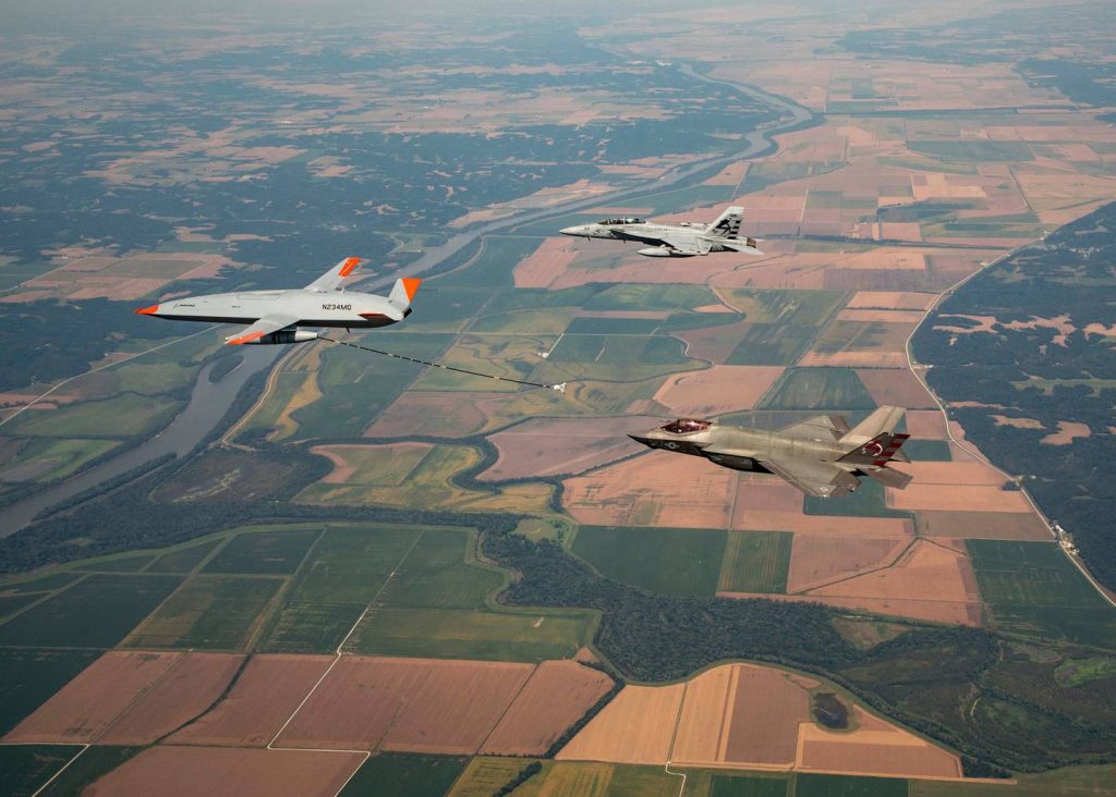 美国海军的MQ-25 Stingray无人油轮使用F-35C Lightning II战斗机进行了首次空中加油,这是第三架飞机,是从海军第一个无人驾驶系统中采取燃料的飞机,该系统旨在在潜在的承运人罢工组中部署。