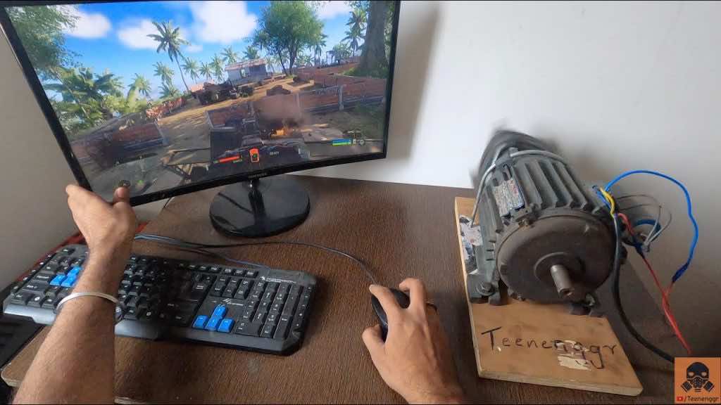 视频中,这个人试图为电子游戏添加更真实的效果。为了达到最佳效果,他把控制器的振动换成了一个噪音很大的马达。这是一个2880转/分的感应电机,因此当他驾驶卡车或开火时振动失控。