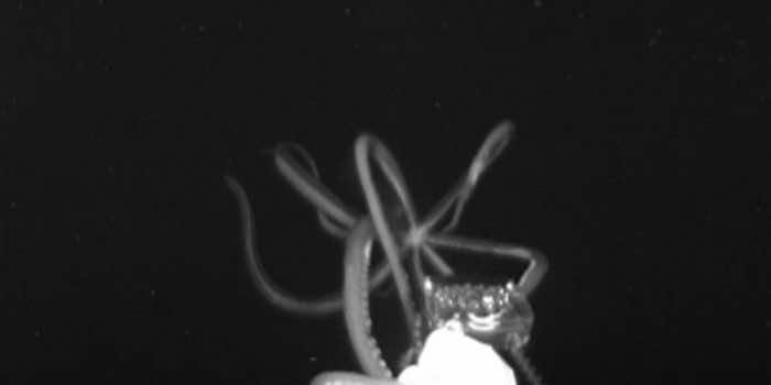 罕见的视频是一只巨大的鱿鱼狩猎猎物,被一个新的摄像头,被动的深海平台捕获,该平台在海洋深处很好,而且也没有吓到深海生物。