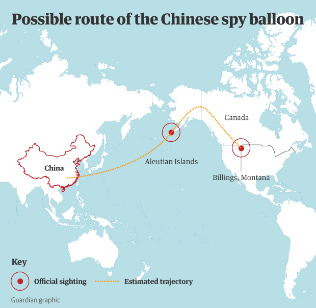 美国军方击落了一架疑似中国间谍气球,该气球在美国上空飞行了数天。美国称一直在监视美国各地的重要军事地点。