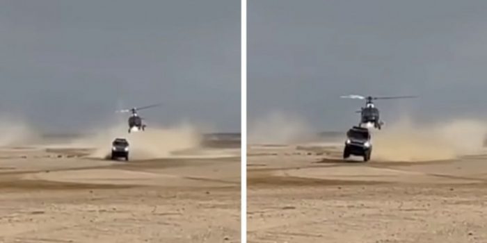 现场似乎是从动作电影中出来的,实际上,实际上是一架直升机从赛车卡车的屋顶上撕下来。但是,命中还不足以影响熟练的驾驶员的表现。