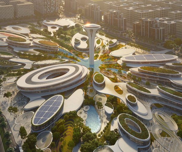 The Aljada Central Hub will feature a central observation tower and that tower will be surrounded by buildings and canopies shaped in such a way that they will create a pleasant environment in the harsh Arabian desert. A design competition was held by the local property developer Arada for the Aljada Central Hub.