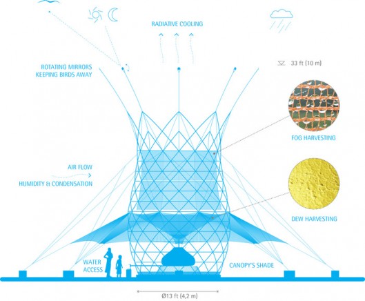 该塔将有一个树冠,可供人们从水箱里抽水,以便他们站在阴影中,并有一系列旋转的镜子将鸟类远离塔。该塔没有电力运行,其结构不需要任何起重机或重型机械。据该公司称,建造塔楼需要六个人四天。在现场组装塔需要四个人三个小时。