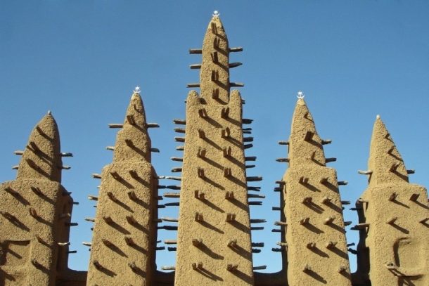 这些泥泞清真寺中最著名的是马里的丹妮的大清真寺。这座巨大的清真寺已经以目前的形式站立了近100年。但是,在同一地点存在的清真寺的原始结构可以追溯到13世纪。多年来,原始清真寺被损坏,后来被用作墓地而不是清真寺。