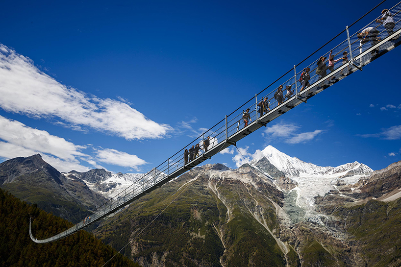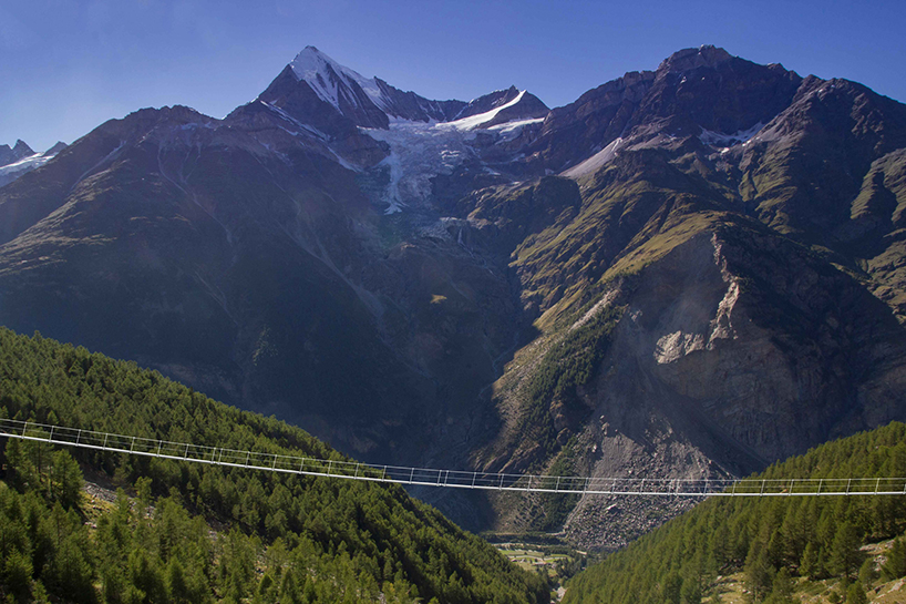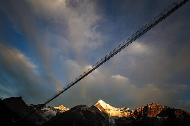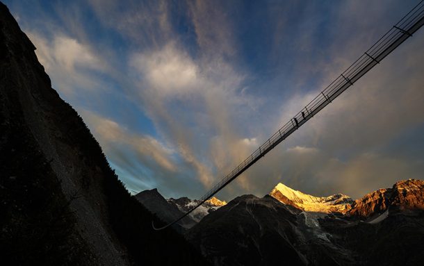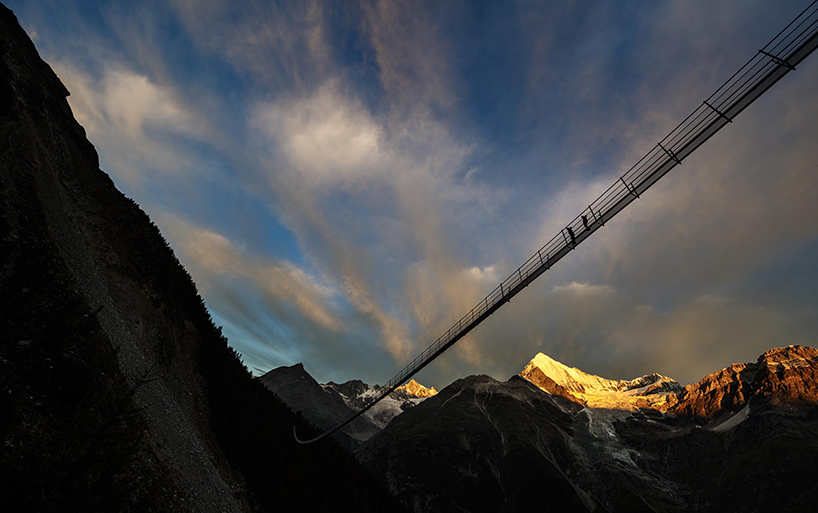 位于瑞士阿尔卑斯山脉中部的查尔斯·库恩吊桥是肾上腺素上瘾者和任何渴望自然之美的人的一种享受。这座494米(1621英尺)高的桥悬挂在山谷地面上85米(300英尺)的高度,整个结构仅在10周内就建成了。这座桥连接了Grächen和采尔马特之间的徒步路线Europaweg,采尔马特被认为是瑞士阿尔卑斯山最美丽的徒步路线。有了这座桥,原本为期两天的欧洲之旅步行只需10分钟。